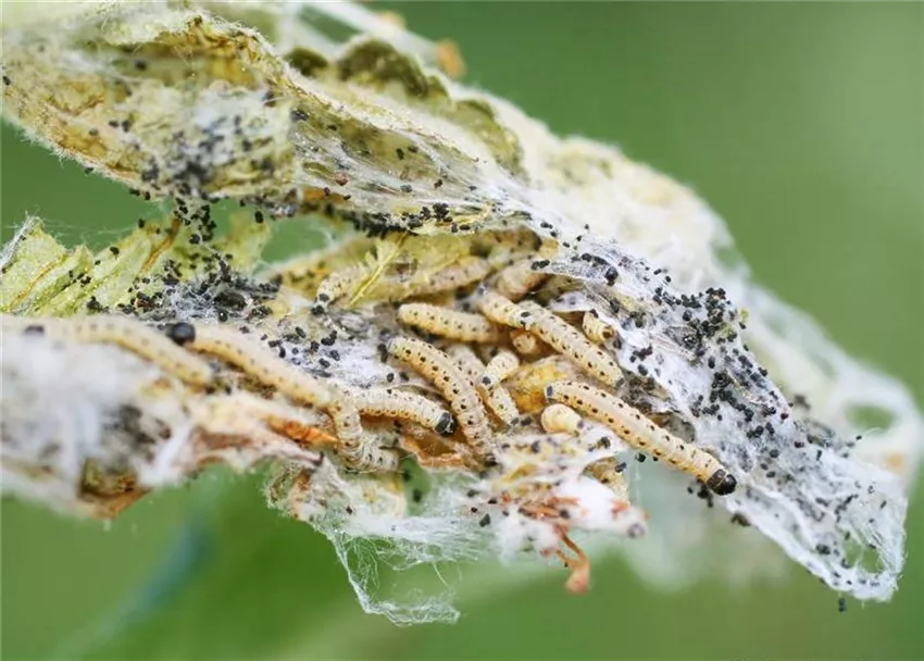 Im Mai und Juni bilden hellgraue oder cremefarbene Larven auffällige Gespinste zwischen kahlgefressenen Zweigen.
