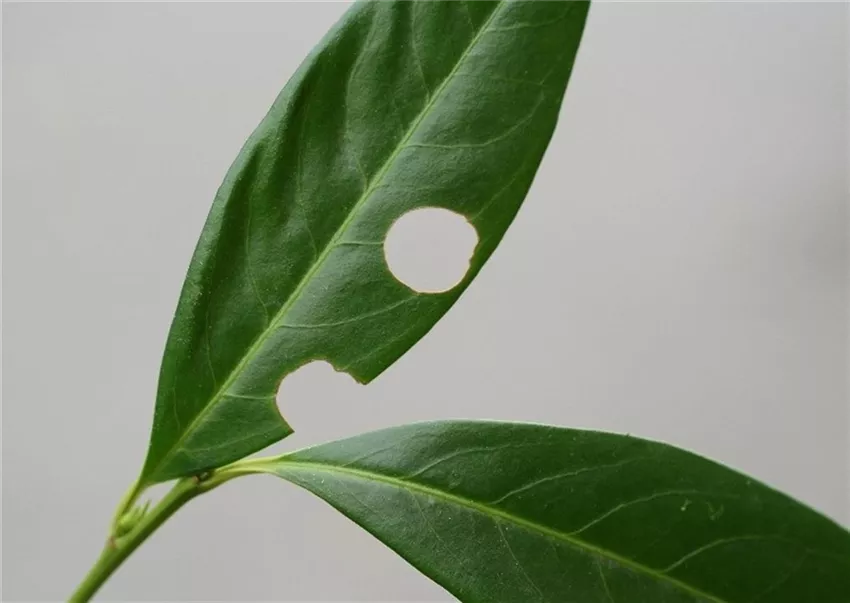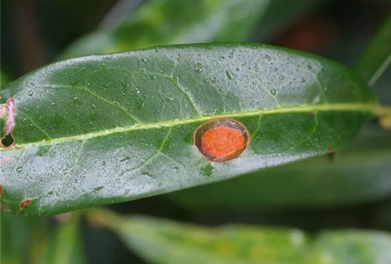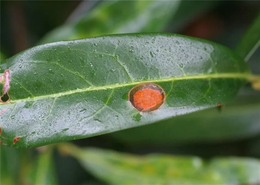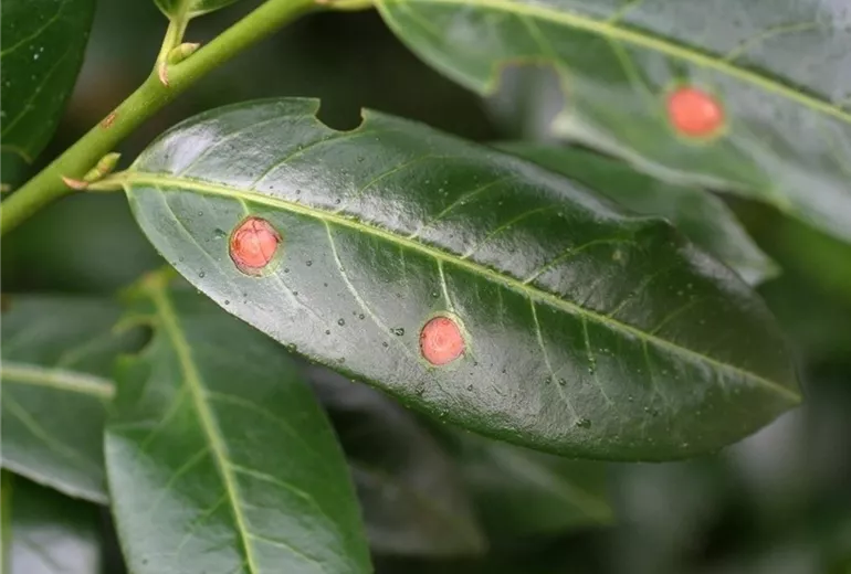 Auf den Blättern entstehen braune bis rotbraune Flecken. Das befallene Gewebe trocknet ein und fällt anschließend aus dem Blatt heraus, so dass im Blatt Löcher entstehen. Zum Teil sehen die Schäden aus wie ein Buchtenfraß durch den Dickmaulrüssler.