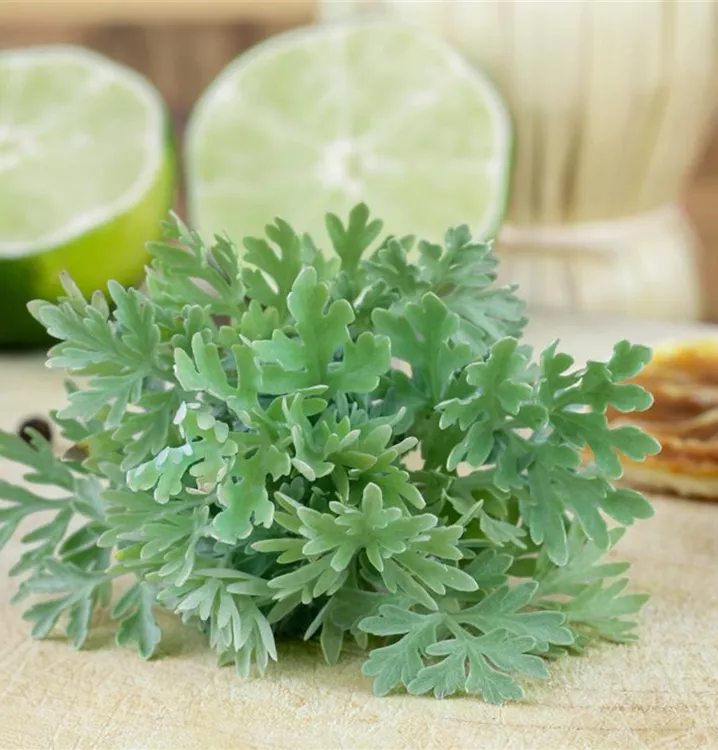 Zum Verzehr geeignet. Die silbrigen Blätter sind gefiedert und überzeugen mit aromatischem Geschmack.