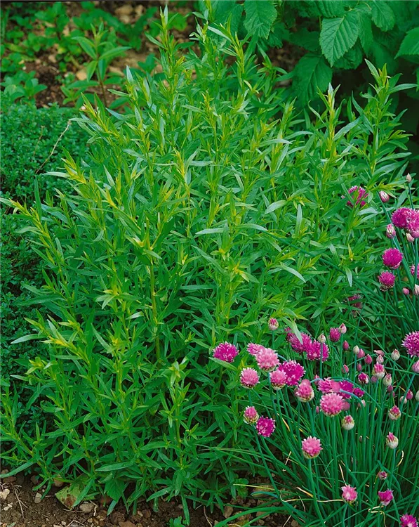 Der Französische Estragon 'Pfefferkorn' (Artemisia dracunculus) ist eine Kräuterpflanze mit einem würzigen Geschmack. Seine mittelgrünen Blätter sind gefingert. Für das optimale Wachstum des Französischen Estragons 'Pfefferkorn' werden ein sonniger Standort und durchlässiger, nährstoffreicher Boden benötigt.