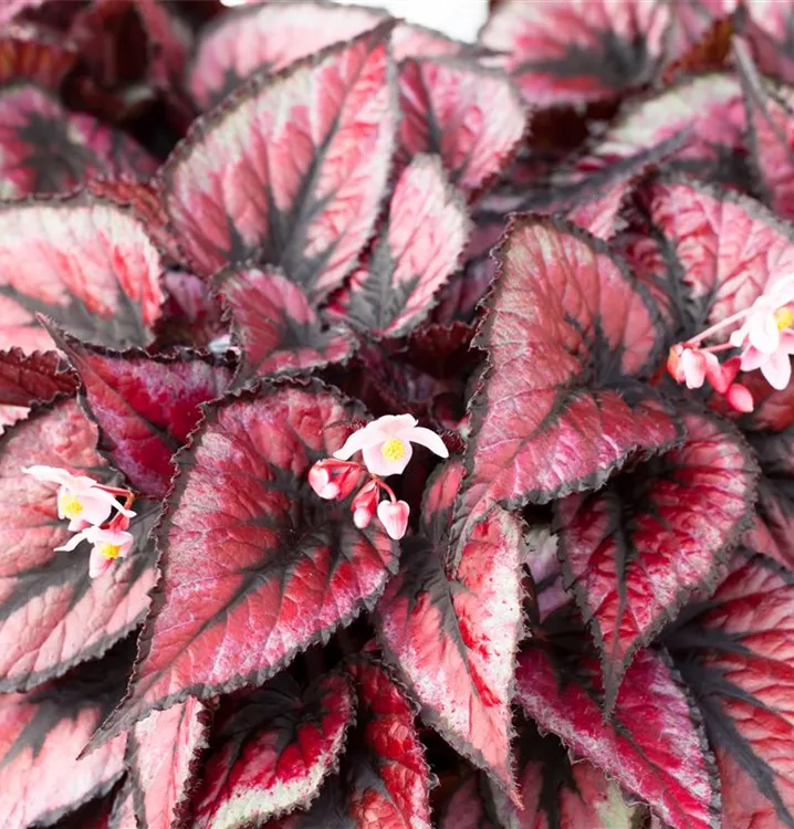 Hoher Blattschmuckwert. Die immergrünen Blätter der Königsbegonie sind bunt, herzförmig, gewellt.