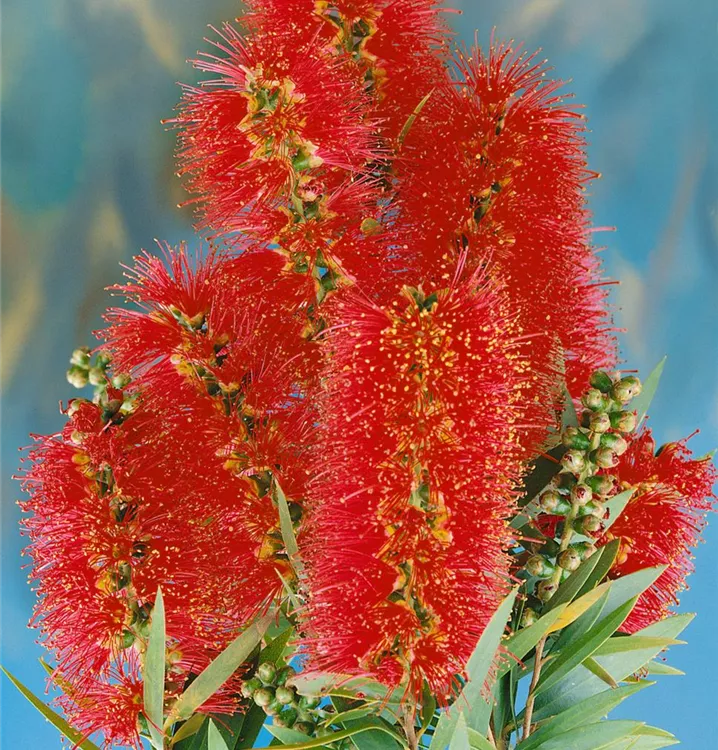 Der Hängende Zylinderputzer (Callistemon viminalis) ist eine sehr beliebte Kübelpflanze. Seine dekorativen Blüten erscheinen von Mai bis September. Verwenden Sie bevorzugt die spezielle Kübelpflanzenerde, denn sie verdichtet sich über längere Zeit nicht.