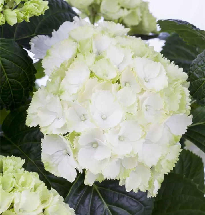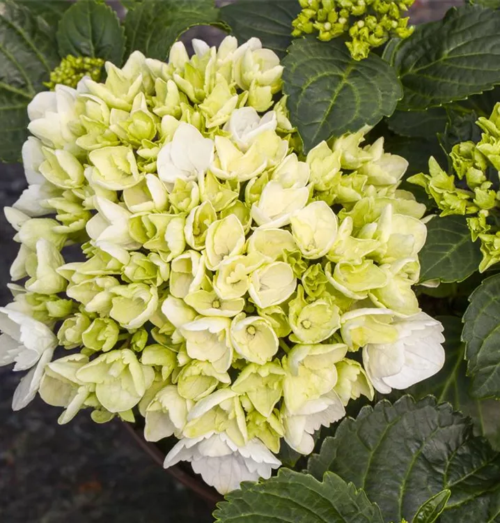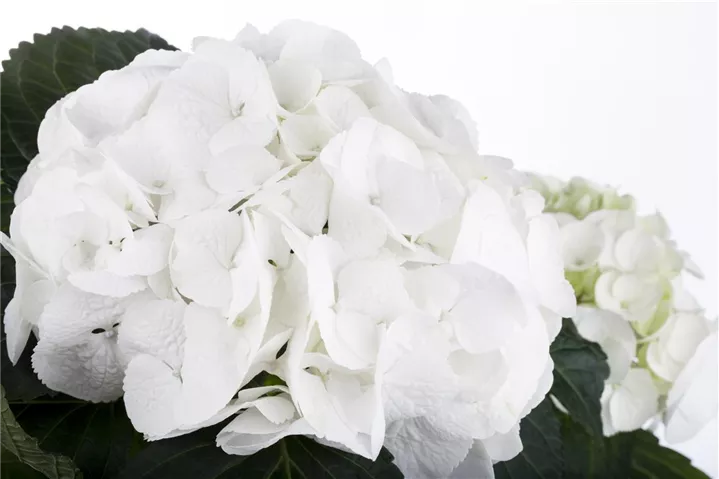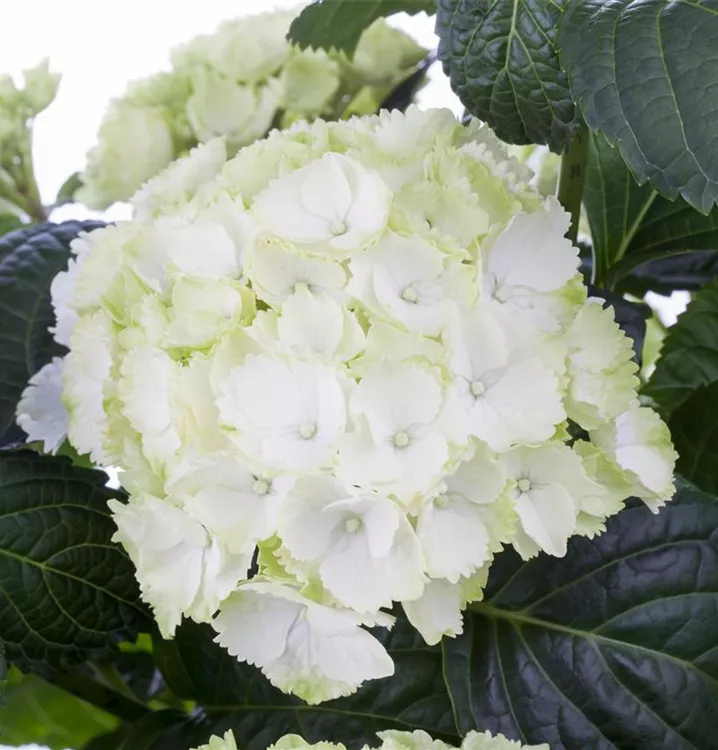 Die sommergrünen Blätter der Bauernhortensie sind mittelgrün, eiförmig, gesägt.