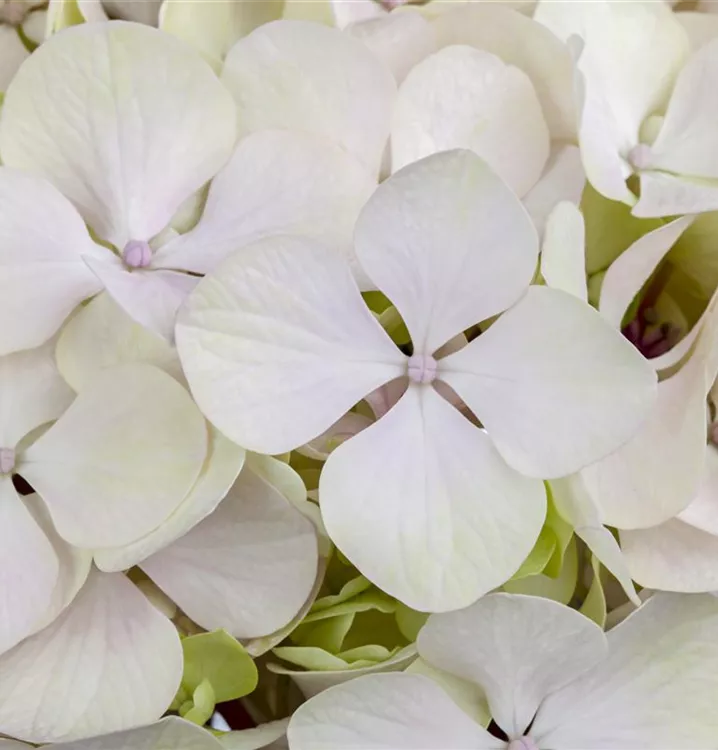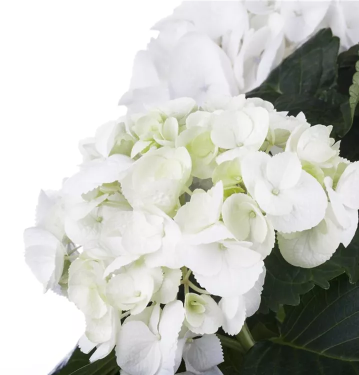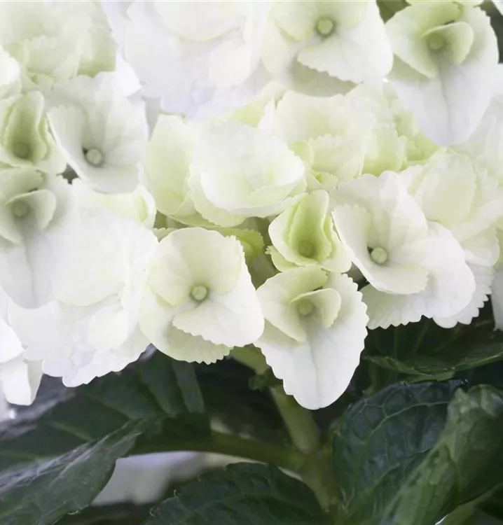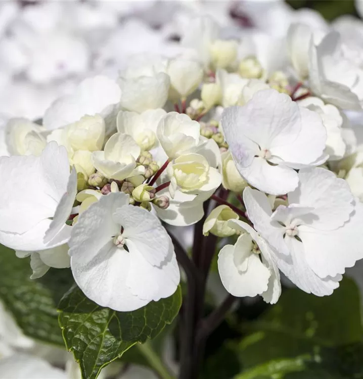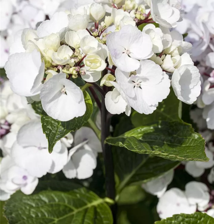Die weißen, schalenförmigen Blüten der Bauernhortensie erscheinen in Dolden von Juni bis September.