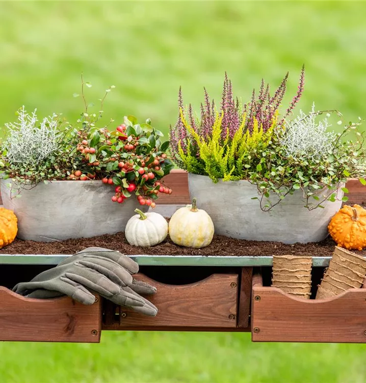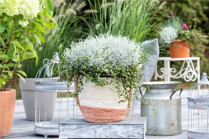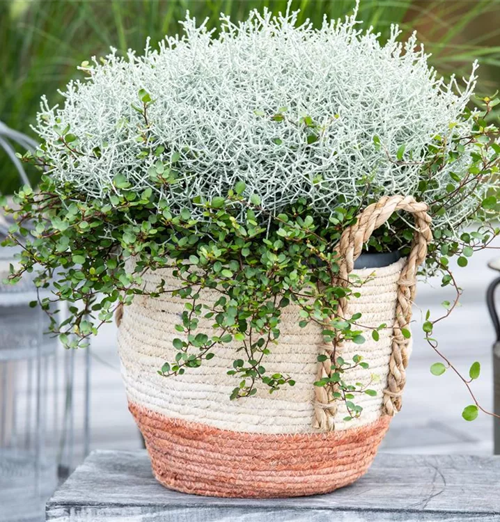 Die silbergrauen Zweige des Gitterkrautes harmonieren hervorragend mit den kleinen grünen Blättern des Drahtstrauches. Diese kombination aus den beiden Struckturpflanzen eignet sich besonders gut für die herbstliche Bepflanzung von Kübeln oder als dekoraive Bereicherung im Blumenbeet.