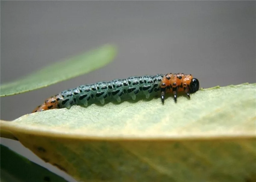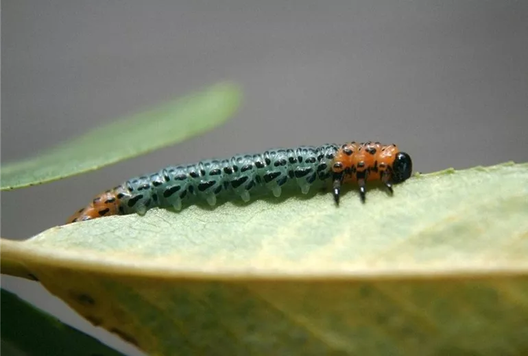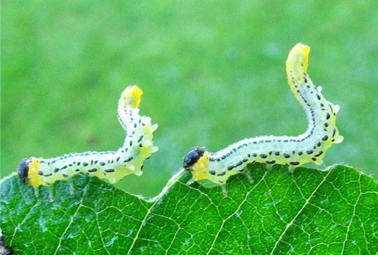 An den Blättern fressen im späten Frühjahr und Sommer gesellig lebende Larven. Sie sind auffällig grün und gelb oder blaugrün und rotbraun gefärbt. Blattwespenlarven können innerhalb kurzer Zeit Kahlfraß verursachen.