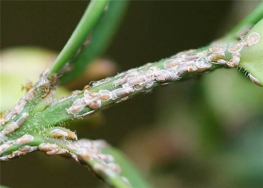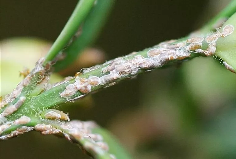 Im Frühjahr schlüpfen die winzigen Larven, die im Jugendstadien noch Beine haben, und verbreiten sich auf der Pflanze, wo sie sich später festsetzen.