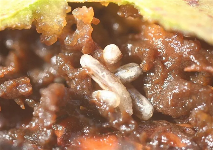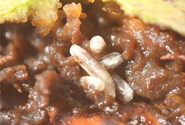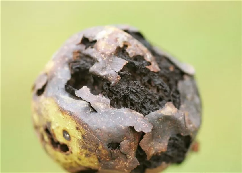 Die grüne Fruchtschale der Walnüsse verfärbt sich schwarz. Sie wird weich und schleimig. Später trocknet das Gewebe ein. In der Fruchtschale fressen die weißen oder gelben Larven der Fruchtfliege, die aber nicht in den Kern, die eigentliche Walnuss, vordringen.