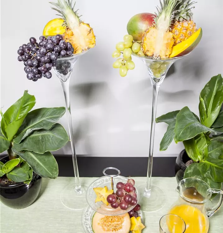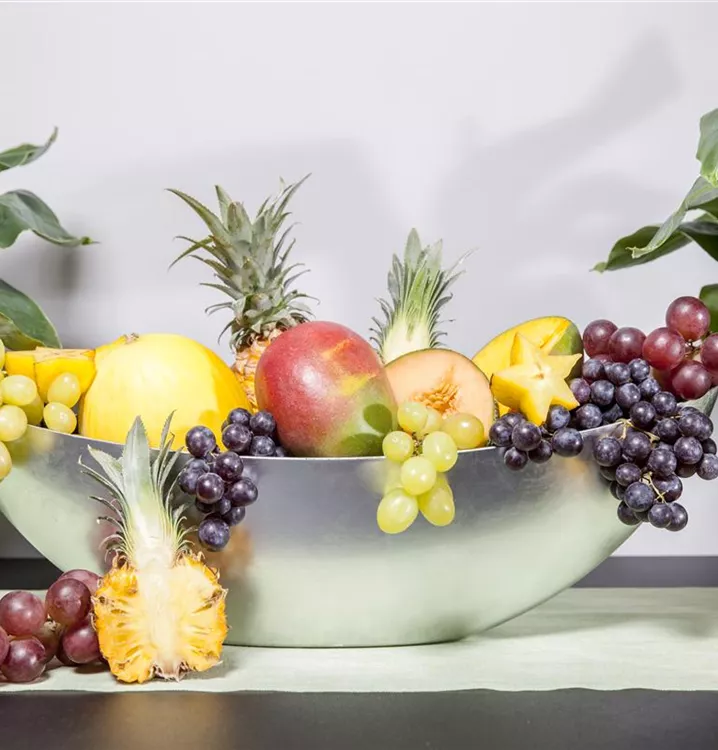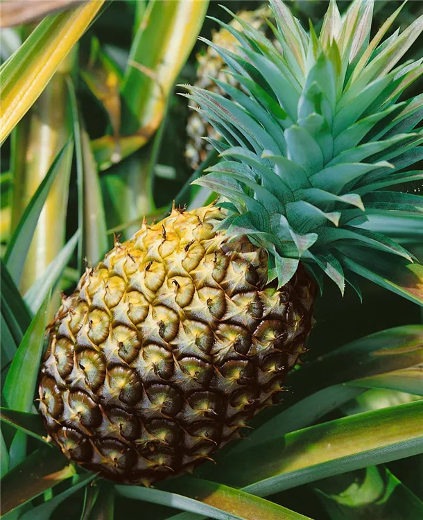Ananas comosus bildet braun-gelbe Früchte mit einem süß-säuerlichen, exotischen Geschmack. Das gelbe Fruchtfleisch dieser ovalen Früchte ist saftig und faserig; die Fruchtschale ist rippig.