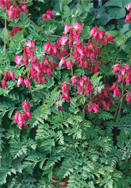 Dicentra eximia bildet in Trauben angeordnete, rosafarbene Blüten ab Mai.