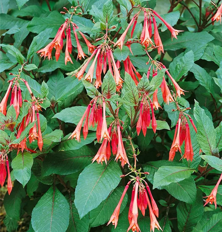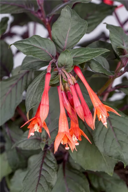 Fuchsia 'Koralle' bildet während der gesamten Saison zahlreiche glockenförmige, lachsrosafarbene Blüten.