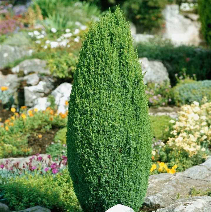 Der Gemeine Wacholder (Juniperus communis) ist ein Großstrauch, welcher säulenförmig wächst und gewöhnlich eine Höhe von ca. 8 m und eine Breite von ca. 3 m erreicht. Seine nadelförmigen Blätter haben eine blau-grüne Färbung. Dekorative schwarz-braune Zapfen zieren Juniperus communis ab September. Dieses Gehölz ist gut frostverträglich. Er bevorzugt durchlässigen Boden in sonniger Lage.