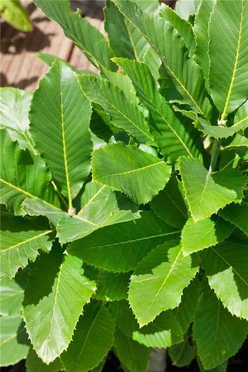 Die sommergrünen Blätter der Pontische Eiche sind mittelgrün, eiförmig, glänzend, wechselständig, gezähnt. Diese sind etwa 15 - 20 cm groß. Pontische Eiche zeigt sich leuchtend goldgelb im Herbst. Lange haftend.