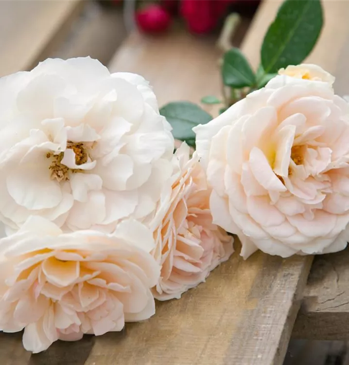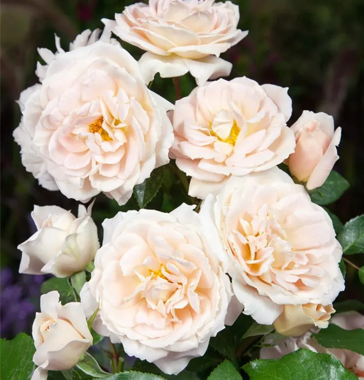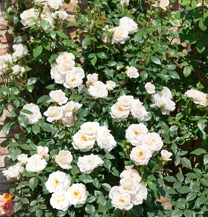 Die Beetrose 'Lions-Rose'<sup>®</sup> (Rosa) ist eine reichblühende Rose, die im Garten eine besondere Rolle spielt. Die zahlreichen starkgefüllten Blüten sind cremeweiß und erscheinen von Juni bis September. Ihr wunderbarer Duft entfaltet sich besonders an sonnigen, warmen Tagen. Mit den richtigen Begleitern an ihrer Seite, kommt die Königin der Blumen besonders gut zur Geltung. Niedrige Stauden, Lavendel und Salbei eignen sich ganz gut für diese Zwecke.