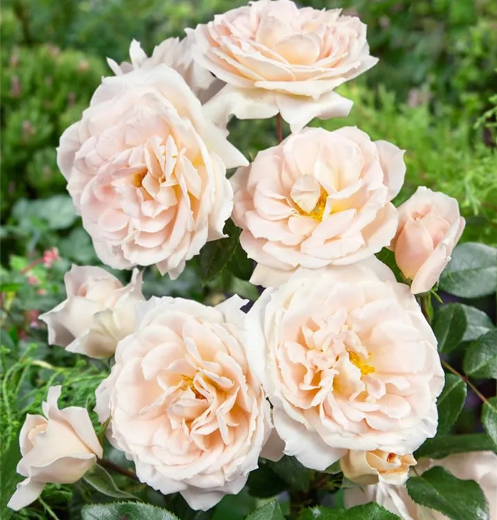 Die cremeweißen, starkgefüllten, schalenförmigen Blüten der Beetrose 'Lions-Rose'® erscheinen in Dolden von Juni bis September. Diese werden etwa 7 - 8 cm groß und sind leicht duftend.